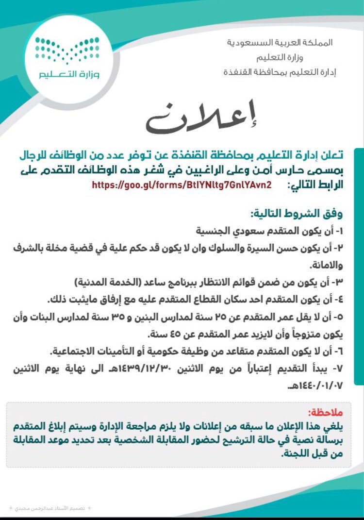 حمد المنيف On Twitter إدارة التعليم بمحافظة القنفذة Qunedu تعلن عن فتح باب التقديم على عدد من وظائفها الشاغرة في مجال الحراسة والتقديم عليها من خلال الرابط أدناه علما بأن