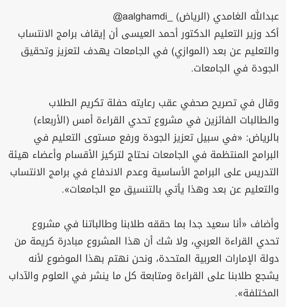 هاشتاق السعودية On Twitter العيسى يوضح أن إيقاف الانتساب والتعليم عن بعد الموازي بالجامعات يهدف لتعزيز جودة التعليم عكاظ
